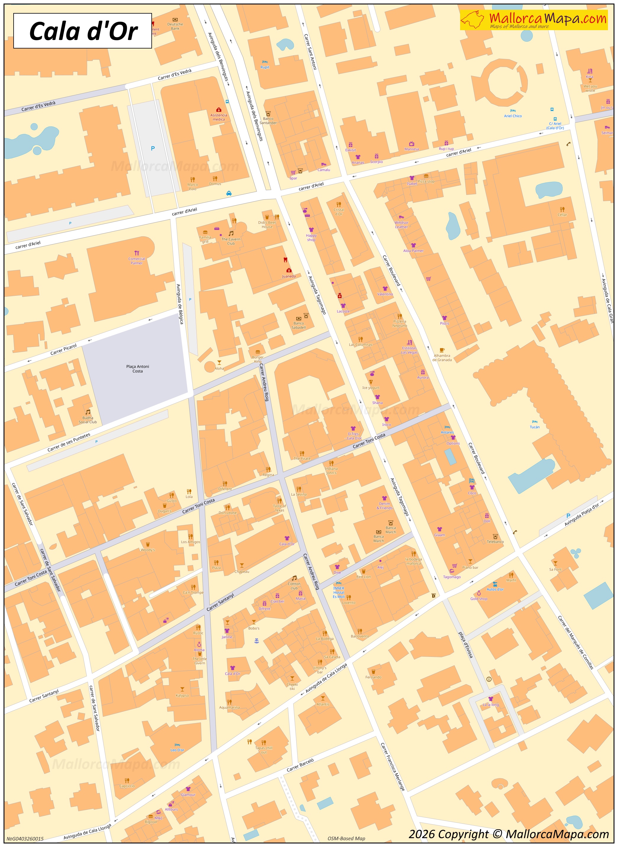 Este mapa de Cala d'Or muestra calles, carreteras, caminos, playas, muelles, edificios, monumentos, aparcamientos, tiendas, iglesias, puntos de interés, miradores, zonas peatonales, faros y parques.